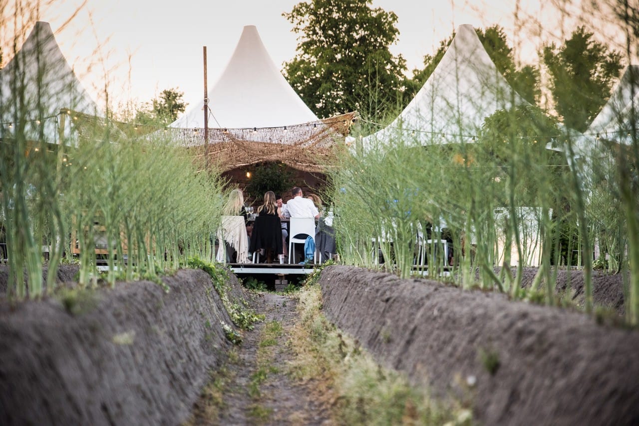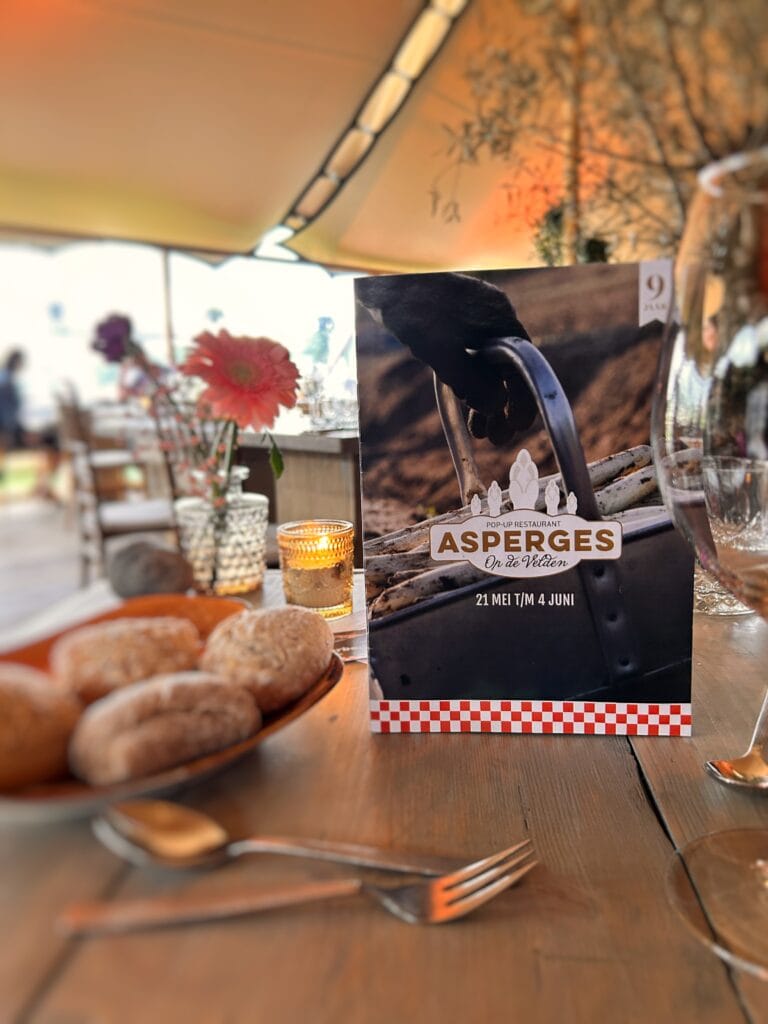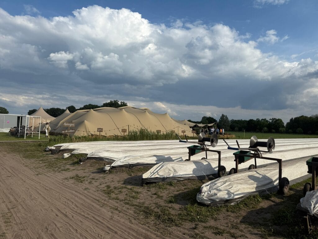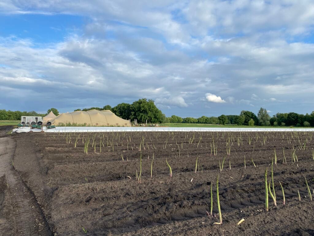 Van 2015 t/m 2018 heeft Asperges op de Velden plaats gevonden bij de Raaijmakers Hoeve in Nuenen. In 2019 is het pop-up restaurant verhuisd naar de velden van Aspergekwekerij Kelders in Veldhoven waar het evenement vier edities heeft gekend. In 2025 zijn we verhuisd naar Aspergekwekerij Vermeer in Leende, waar we ook in 2026 zullen neerstrijken. Ons sfeervol ingerichte openluchtrestaurant ligt midden in de aspergevelden en biedt zowel ruimte voor kleinere groepen, sfeervol en intiem, als voor grotere gezelschappen tot een maximum van 180 (overdekte) zitplaatsen. Daarnaast beschikken we over een (deels) overdekt aangrenzend terras dat tevens ruimte biedt aan 100 extra gasten.